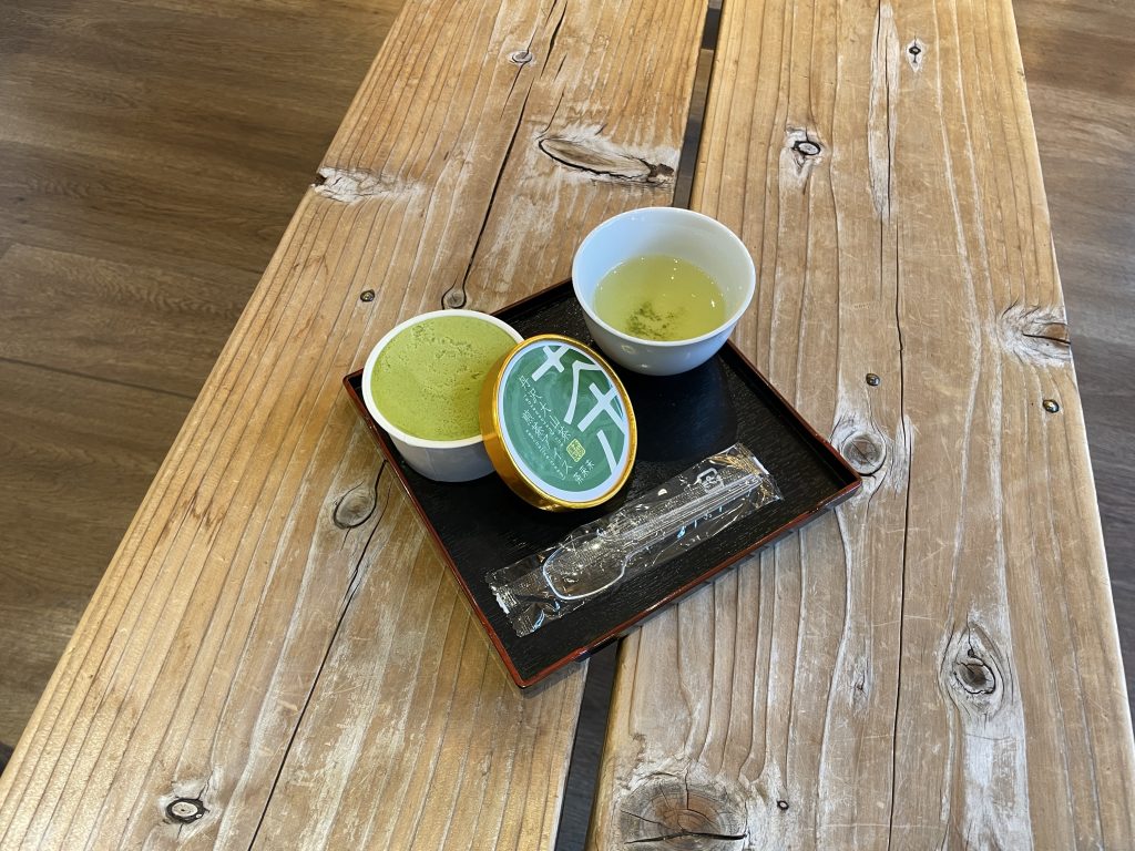 今回は丹沢大山茶の煎茶アイス一個340円程度で購入しましたが、お茶のサービスもいただきました!外は寒いので中で試食させていただきます。